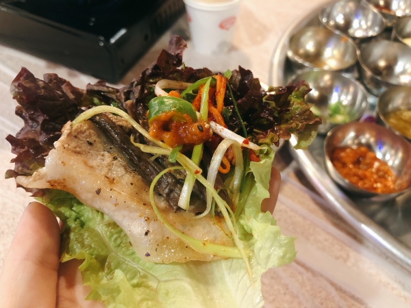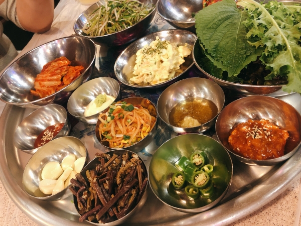 소스도 여러 종류라서 입맛에 맞게 먹을 수 있고, 고사리 콩나물 파채 김치 등은 그냥 집어먹어도 맛있고 쌈에 넣어먹어도 맛있습니다.