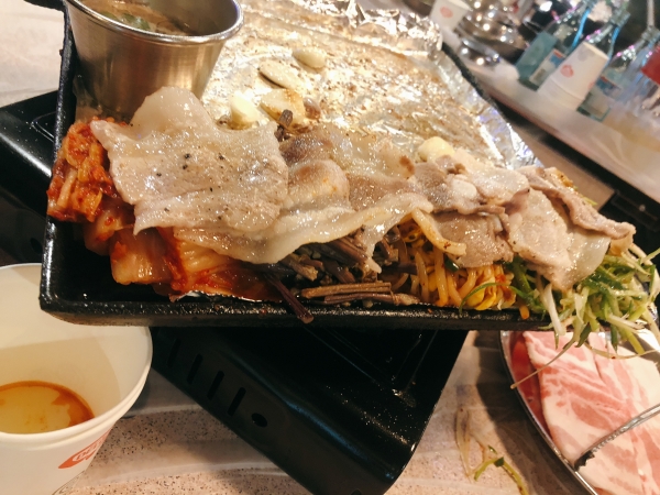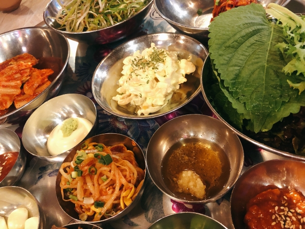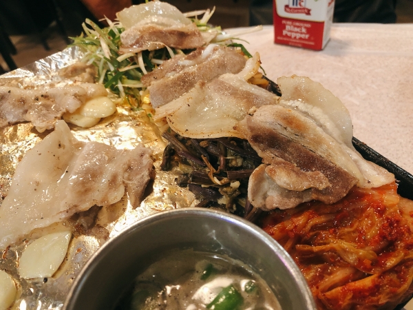 밑반찬들을 불판 구석에 쭉 세팅하고 굽는 동시에 고기에는 후추를 뿌려가며 능숙하게 구워내는데, 어떻게 먹어야 할지 막막한 초보에게 딱 좋습니다.